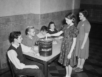 Students are casting ballots for the student body president of the McLean Junior High School. Seated from left to right, are Robert Campbell, Clark Gillespie, Bobby Avinger, Lorena Coleman. Dropping ballot in the box is Elizabeth Green and Kathleen Weatherford is standing next to her. A large box labeled "Ballots" is on the table. Published in the Fort Worth Star-Telegram evening edition November 8, 1940.