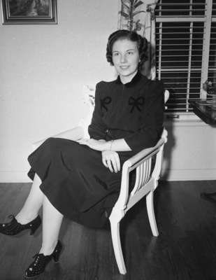Shown here is Jean Malone. She is sitting on a chair and wearing a dress. Published in the Fort Worth Star-Telegram.
