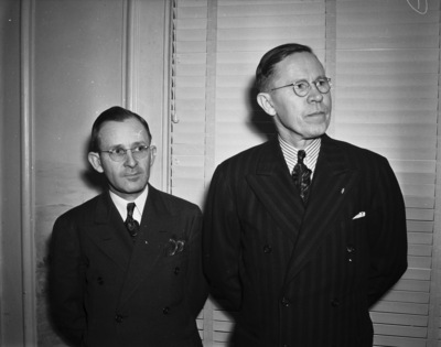 Scenes at Annual Chamber of Commerce Banquet -- Bob Blanton (left), secretary-manager of Paris, Texas Chamber of Commerce, and Joe W. Wunsch, president of Paris, Texas Chamber of Commerce, attended the annual Chamber of Commerce banquet and civic roundup at Hotel Texas. They are shown standing in front of a window with the blinds shut. Both are wearing suits and eyeglasses. Published in The Fort Worth Star-Telegram morning edition, January 20, 1940.
