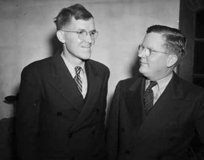 Central Texas Methodist Conference attendees include (left to right) G. M. Greebon, Gustine, Texas and Reverend B. L. McCord, Granbury, Texas. Both men wear coat, tie and eye glasses in this causal half length photograph. The conference voted to increase the assessment for support of retired ministers and a raise in the salary for the pastors. Published in the Fort Worth Star-Telegram morning edition, November 9, 1940.