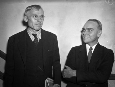 Central Texas Methodist Conference attendees include (left to right) J. W. Chisholm, Rising Star, Texas and Reverend Thad E. Son, Maypearl, Texas. Both men wear coat and tie in this causal half length photograph. The conference voted to increase the assessment for support of retired ministers and a raise in the salary for the pastors. Published in the Fort Worth Star-Telegram morning edition, November 9, 1940.