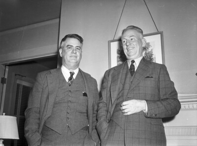 The last time the Spiller brothers posed for a picture together was in 1917 when they were captains in the United States Army. They are, left to right, Hampden Spiller and Oliver L. Spiller. The brothers are natives of Jacksboro, Texas. Hampden left the Army at the end of the war and began practicing law in Fort Worth, Texas. Oliver remained in the Army and is now a Brigadier General. He is the commander of the new anti-aircraft training center at Fort Bliss. The brothers are shown in Hampden's house, during Oliver's first trip to Texas in ten years. Hampden is dressed in a three-piece suit. Oliver is wearing a plaid three-piece suit.