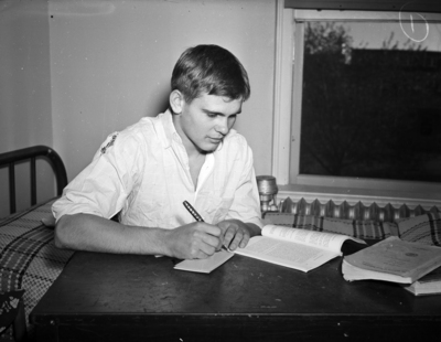 The Masonic Home Football team has a good group of young and veteran players leading them to a District Seven Division title. Taking time away from football to study is Floyd Lewis. Floyd is a talented tackle for the Masons. He is sitting at the desk in his bedroom, dressed in a button-up shirt.
