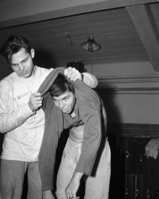 The Arlington Heights Jackets are serious but confident as they prepare for their all-important game with the Masonic Home Masons. Here are some of Mack Flenniken's veterans getting ready to practice. Shown here are High School players (left to right) Lawrence Payne aiding Billy Hearne pull on his Jersey. Mr. Payne is wearing a loose, long sleeved shirt and sweats and is holding Mr. Hearne's jersey over Hearne's head. They are standing in a locker room with a row of lockers visible behind them. Star-Telegram Evening, November 13 1940.