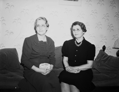 Sitting left to right are Mrs. A. J. Messersmith and Mrs. E. P. Smith, who are honored at a tea given by the Modern Martha Class of First Presbyterian Church at the home of Mrs. R. F. Loughridge, 5512 Collinwood Avenue, Fort Worth, Texas. Mrs. Messersmith will leave soon to make her home in Chicago and Mrs. Smith will go to Dallas to live. They are both wearing dresses and eyeglasses. Mrs. Smith is wearing a necklace. Published in Fort Worth Star-Telegram.