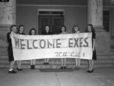 Texas Christian University homecoming participants hold a banner "Welcome Exes". These seven girls designated as "hostesses" from the various dormitories include (left to right) Frances Stevens, Palestine, Tomlinson House ; Peggy Greene, Vernon, Texas, Jarvis Hall ; Suzy Shipp, Liberty Hill, Texas, Jarvis Hall ; Clada May Jones, Temple, Texas, Gibson House ; Jean Sisson, Houston, Texas, Van Zandt House ; Marjorie Stevenson, Sweetwater, Texas, Sterling House ; and Frances Jones, Abilene, Texas, Reid House. Published in the Fort Worth Star-Telegram morning edition, November 15, 1940.