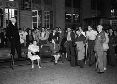 from Chapel Hill, N. C. President E. M. Waits, standing on bench. Next to him is L. D. (Little Dutch) Meyer, big league baseball player. Next is Head Coach Dutch Meyer; halfback Gus Bierman, Line Coach Mike Brumblelow. Malven Stevenson ( on crutches) student body president and Amon Carter.