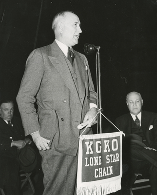 Amon G. Carter, Sr., speaking at the dedication of Will Rogers Memorial Coliseum. Mr. Carter is standing in front of a microphone. There is a "KGKO Lone Star Chain" banner attached to the microphone stand. There are seated unidentified men behind Mr. Carter.