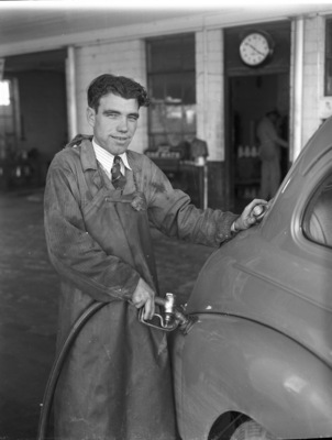 Lewis William Crutsinger. 24, is a draft volunteer to enter the United States Army. He is shown pumping gas into a car. He is wearing coveralls and an apron that has a lot of grease stains. In the background is the mechanic shop.