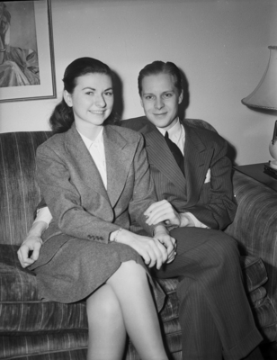 Mrs. Bobby Byrne, the former Patsy Farrell, is welcoming her husband to Fort Worth, Texas. Mrs. Byrne is in town visiting her parents Mr. and Mrs. Jack Farrell. Mr. Byrne is maestro of a newly formed but successful orchestra. The couple met in Dallas, Texas, in 1938 and were married in New York City, New York. They are sitting next to each other on a couch. Mrs. Byrne is wearing a button-up blouse, blazer, and a skirt. Mr. Byrne is dressed in a double breasted pinstripe suit.