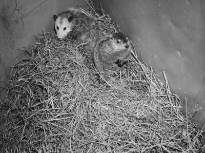 Hay-mates at the Forest Park Zoo are "Oscar IV," the groundhog, right, and "Hot Yam," a possum. They're bedded down together in the chimpanzee house so that Oscar IV won't tunnel his way out and be missing on February 2nd.