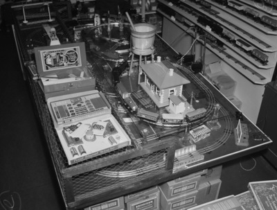 Santa Claus will have an assortment of toys to choose from when he sets out to reward good little boys and girls this Christmas. Several of the most popular gifts he stow away in his bag are pictured here. Junior can turn into quite a carpenter with the tool chest at the top left. Those are building parts and a telegraph set at bottom. And at the right is the present which will keep father on his hands and knees all day long, a train set, complete with engine and six cars, a track station and water tower. Fort Worth stores have score of new toys this year. Published in the Fort Worth Star-Telegram evening edition, November 21, 1940.