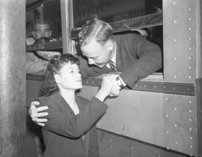 Tarrant County said goodbye to its first contingent of 56 trainees. Shown here is trainee Herbert E. Hoover, one of seven volunteers chosen by draft board no. 3, and fiancee, Miss Hazel Maddox, saying goodbye. She is the daughter of Mr. and Mrs. A. C. Maddox. In the picture Mr. Herbert is half way out through the bus window wanting to hug Ms. Maddox; Ms. Maddox is grabbing his hand. The chartered bus took trainees to the Dallas induction station. Published in the Fort Worth Star-Telegram evening edition, November 20, 1940.