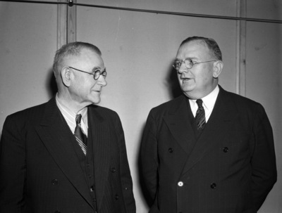 Left to right, B. B. Cobb and W. M. Green. The men are having a casual conversation in this half length photo.