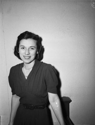 Joyce Rickard. Half-length portrait, wearing a dress and smiling. Her parents live at Plymouth, Devonshire. Her father and brother are serving in the Royal Navy.