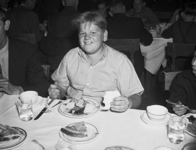 Thanksgiving dinner for Star-Telegram boys. Shown is Howard Dodd, newspaper boy, seated at the table. He is wearing a short sleeve shirt. He is holding a piece of bread in his left hand and a spoon in his right hand. The table is covered in a tablecloth, his plate is filled with food, another plate has a piece of pie on it. Glasses of iced water, empty coffee cups, and utensils are also on the table. Other boys and men are in the room. Published in the Fort Worth Star-Telegram morning edition, November 22, 1940.