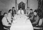 Texas Wesleyan College senior football players sitting around a table (left to right) are Homer Craig, Wayne Hillery, John Hosea, Foster Miller, Bill Stokes, Steve Scarafiotti, and Lem Bray. The players are wearing long-sleeved shirts and ties with Hosea, Scarafiotti, and Bray all wearing letter jackets. On the table are are plates, bowls, and silverware. Behind the players, there is a plant and a window with the curtains pulled to the sides. Star-Telegram Morning, November 24 1940.