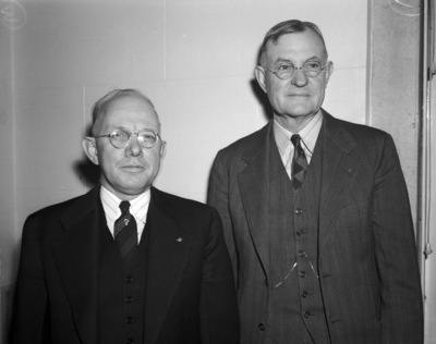 Texas State Teachers Association convention. E. E. Rogers, left, principal at Denison and G. C. Book, superintendent at Petrolia. They are standing next to each other. Published in Fort Worth Star-Telegram, morning edition, November 22, 1940.