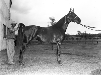 Image shows "Astral Marillo," is a five gaited mare owned by C. T. McLaughlin of the Diamond M. Ranch in Snyder, Texas. The three-year old mare defeated mature horses to win the five-gaited stake at the Tri-State Fair Horses Show in Clovis, New Mexico. Astral Marillo is a descendant of one of the first families of Texas saddle horses and is regarded as the most outstanding West-Texas bred saddle horses. On left is a unidentified man. Published in the Fort Worth Star-Telegram evening edition January 26, 1941.
