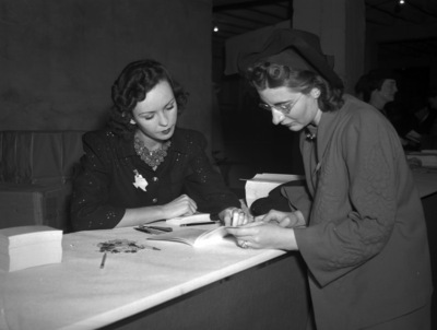 Texas State Teachers' Association convention. Maxine Asbury, left, registers Mrs. M. E. Fair of Elm Mott High School. Published in Fort Worth Star-Telegram, evening edition, November 22, 1940.