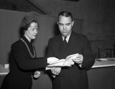 Texas State Teachers' Association convention. Mrs. Claude Sammis of headquarters office assists W. T. Powell, El Paso, Texas, with his schedule. Published in Fort Worth Star-Telegram, evening edition, November 22, 1940.