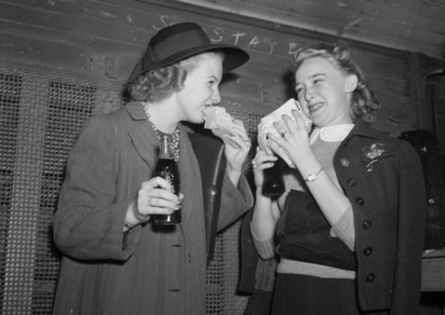 Texas Christian University (TCU) football fans en route to Houston for the Rice University vs. Texas Christian University game include (left to right) Betsy Wright and Nancy Jo Nolte, both of Fort Worth, Texas and both Texas Wesleyan College students.