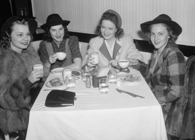 Texas Christian University (TCU) students off to see the football game with Rice University. Eating in the station café. Left to right, Billie Marie Latham, Jean Morrison, Elizabeth Patterson and George Ann McInnis.