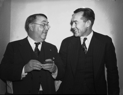 The Texas League Baseball Officials are responsible for the high standard of baseball in the league. Left to right are Walter Morris and Bob Linton. Mr. Morris is a Fort Worth, Texas business manager. He is wearing a three piece suit. He is smoking a cigar and has a newspaper in his jacket pocket. Mr. Linton is the player manager for the Fort Worth Cats. He is dressed in a three piece, pinstripe suit. Published in The Fort Worth Star-Telegram Sunday Edition January 21, 1940.