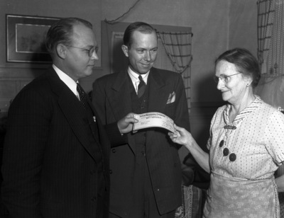 When Santa Arrived Month Early. Santa Claus arrived a month early for Mrs. C.W. Alworth, Ranger, right, as she received a $500 check. Mrs. Alworth was second prize winner in the $25,000 national Spry contest. Mrs. Alworth says she plans to use the $500 to brighten Christmas for a number of her friends. Mrs. C. W. Alworth, Ranger, Texas, shown receiving $500.00 check from O. B. French, sales supervisor for Lever Brothers. George F. Bunt city salesman for Fort Worth, Texas, for Lever Brothers Manufacturing Company, is in the center. Published Fort Worth Star-Telegram Evening Edition November 26, 1940.