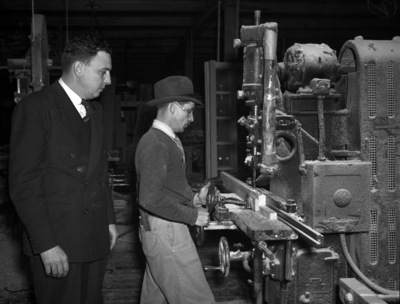 National Defense Program. J. R. Salmon, assistant manager of Texas Sash and Door Company, looks on while Curtis Pool operates a chisel mortiser in one phase of the $81,000 window sash, door and screen job which the company is handling for Camp Bowie, Brownwood. Published in the Fort Worth Star-Telegram morning edition, November 27, 1940.