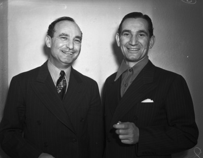 The Texas League Baseball Officials are responsible for the high standard of baseball in the league. Left to right are Hyman Donosky and George Schepps. Mr. Donosky is the secretary for the Dallas Rebels. He is wearing a double breasted pinstripe suit. Mr. Schepps is president of the Rebels. He is wearing a pinstripe suit, without a necktie. Published in The Fort Worth Star-Telegram Sunday Edition January 21, 1940.