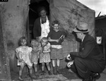 Santa Claus doesn't know them. Who wouldn't give a dollar to bring a really happy smile to the faces of these youngsters who know no Santa Claus except the Goodfellows. Bradley Burks, vice president of the North Fort Worth Kiwanis Club, who paid this home a visit with a group of other club leaders the other day is asking the quartet, whose mother is a widow, what they most want this Christmas. Goodfellows member Bradley Burks, vice president of North Fort Worth Kiwanis Club, shown with widowed mother and her four children standing outside the shack they are living in. Published Fort Worth Star-Telegram November 29, 1940.