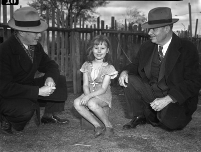 Conducting an interview for Santa Claus, W.O. Coles of the Lions Club, left, and E.D. Rutledge of the Kiwanis are shown as they found out what this 8-year-old girl wanted for Christmas on a recent visit club leaders made to some of the homes assisted by the Star-Telegram Goodfellows. At this one there were four children, all under 11, huddled together in a home while their parents sought work. Goodfellow contributions to pay for stockings and sweaters and candy bought for youngsters like this may be made through The Star-Telegram cashier to get the fund out of the red by Christmas. Goodfellows W. O. Coles of the Lions Club, and E. D. Rutledge of the Kiwanis Club are shown with an 8 year old girl. Published Fort Worth Star-Telegram Evening Edition December 19, 1940.