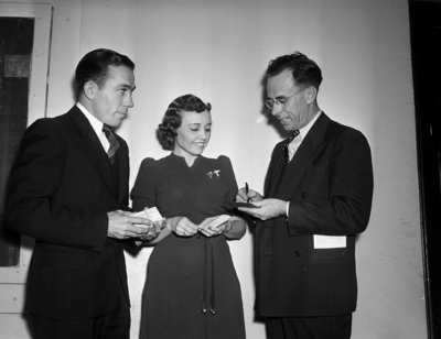 I. E. McWhirter, right, circles the dates, Dec. 4 and 11, on his pocket calendar as a reminder that on these nights the Footlite Club of First Methodist Church will present the second of its four plays this season- "Icebound," Pulitzer Prize winner written by Owen Davis. Ready to sell tickets to anyone are Bob Hamilton, ticket sales chairman, and Miss Maybell Criner, club president. McWirter has been teacher of the church's Co-Worker Class, sponsor of the club, for 13 years. He is wearing spectacles, a striped collared shirt, pocket square and suit. Miss Maybell Criner is wearing a dress with an airplane and parachute pin. Bob Hamilton has his hair slicked back and is wearing a suit and tie. Published in Fort Worth Star-Telegram evening edition November 28, 1940.