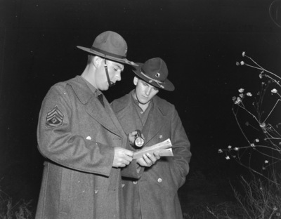 National Guardsmen leaving for Fort Bliss, El Paso, Texas. First Sergeant Samuel D. Swanson, calling roll while Corp Charles W. Richardson illuminates the roster with his flashlight. Both men are wearing full uniform and hats and are standing in a field. Published in the Fort Worth Star-Telegram Evening Edition, November 27 1940.