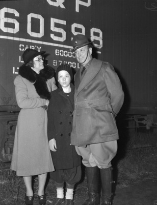 National Guardsmen leaving for Fort Bliss, El Paso, Texas. Major John W. Naylor, commander of the First Squadron, Fifty-sixth Cavalry Brigade, shown with his wife, Mrs. Pauline Naylor, and their oldest son, John Junior standing in front of a train car. Major Taylor is wearing a military uniform and hat. Published in the Fort Worth Star-Telegram Evening Edition, November 27 1940.