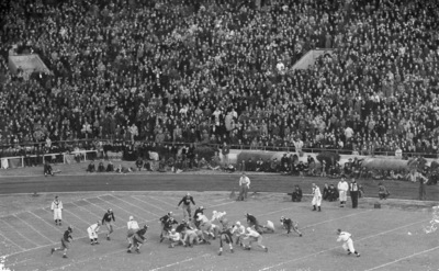 Texas A & M University versus University of Texas football game. Texas Longhorn, Pete Layden, fumbles a pass as Texas A & M player Bill Buchanan swept in to grab the ball. John Kimbrough, A & M No.39 is watching the action. The Longhorns were rolling toward another score when this play bobbed up to spoil the opportunity. It was first down on the Aggie eight when Layden fumbled a bad pass from center. Bill Buchanan, A & M's right end, swept in and grabbed the ball on the bounce. This happened in the second quarter. From here the Aggies launched their best attack. A distance shot of the players in action on the field. The stands are full of spectators. Star-Telegram Evening November 29, 1940