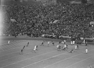Texas A & M University versus University of Texas football game. On fourth down and with four yards to go, the Texas Longhorns' Pete Layden passed to Malcom Kutner for a first down on the eight yard line in the second quarter of the classic at Austin Thursday against the Texas Aggies. On the next play, however, a bad pass-back from center gave the Aggies the ball on the 10 yard line. Longhorns cite this drive as proof that their team's first-minute touchdown was no fluke. The Aggies threatened to score only once. An action shot of the players on the field with the spectators in the background. Star-Telegram Morning December 1, 1940