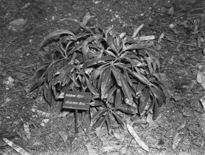 It May Bloom, and It May Not. Will it bloom at Christmas? This is the Christmas rose plant at the Fort Worth Botanic Garden, which last year attracted nationwide attention because of its blooms during Yule season. Whether it will bloom this Christmas remains problematical. Photograph of a plant with a small sign in front of it with the words "Helleborus Niger Christmas Rose."