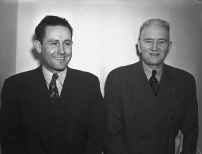 The Texas League Baseball Officials are responsible for the high standard of baseball in the league. Left to right are Homer Peel, and Bonneau Peters. Mr. Peel is the manager of the Shreveport Sports. He is dressed in a three piece pinstripe suit. Mr. Peters is president of the Sports. He is wearing a double breasted pinstripe suit. He is holding a newspaper under his arm. Published in The Fort Worth Star-Telegram Sunday Edition January 21, 1940.