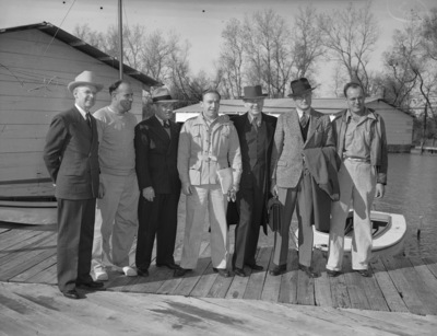 City and County officials and representatives of the Chamber of Commerce and other civic organizations watching the patrol bomber seaplane from the shore, northwest end of Lake Worth when the 14-ton patrol bomber seaplane landed. The huge plane is the first of 250 of this type to be delivered to Britain by Consolidated Aircraft Corporation in San Diego to New York as the United States' aid to embattled Britain. While fuel was being pumped into its tanks, the crew of seven greeted a group of Chamber of Commerce and city official. Left to right, H. S. Foster, manager of the Chamber's industrial department; First Lieutenant Douglas T. Kelley, U. S. Air Corps; Russ Rogers operations manager for Consolidated; Lieutenant W. L. Cleveland, U. S. Navy, the pilot; D. L. Johnson, chairman of Chamber's aviation committee; Captain I. G. Ross of Canadian-Pacific Air-ways, and D. E. Harris, the flying boat's radio operation. Published in the Fort Worth Star-Telegram morning edition, November 30, 1940.