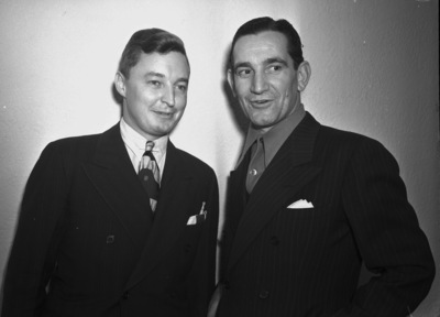 The Texas League Baseball Officials are responsible for the high standard of baseball in the league. Left to right are W. O. Briggs Junior and George Schepps. Mr. Briggs is the Beaumont Exporters' vice-president. The Exporters are the minor league affiliate of the Detroit Tigers. He is dressed in a double breasted suit with a handkerchief and a pencil in his pocket. Mr. Schepps is the president of the Dallas Rebels. He is wearing a double breasted pinstripe suit without a necktie. Published in The Fort Worth Star-Telegram Sunday Edition January 21, 1940.