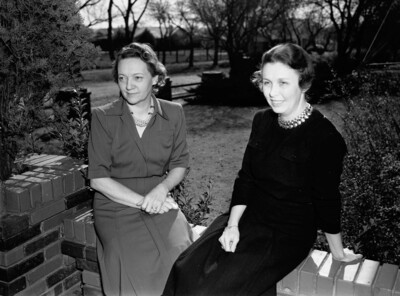 The alumnae of the Pi Beta Phi Sorority are holding a tea hosted by Mrs. H. B. Fuqua. Sitting on a short brick wall, left to right, are Mrs. Fuqua and Mrs. Harry Brelsford. Mrs. Fuqua is wearing a button-up blouse, skirt, and a pearl necklace. Mrs. Brelsford is the general chairman of the tea. She is wearing a dark dress and a necklace.