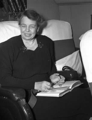 Mrs. Eleanor Roosevelt is shown in an airplane at the Fort Worth, Texas airport. Mrs. Roosevelt is in Texas to finish up her 1940 speaking tour with three speaking engagements in Texas this week. This wraps up the official business of her second term as First Lady. She is wearing a dark colored-dress with pearl necklace. She has a book in her lap and is holding a pair of glasses in her hand. Published in the Fort Worth Star-Telegram morning edition, December 2, 1940.