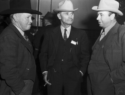 The Texas Sheep and Goat Raisers Association is holding their annual convention in San Angelo, Texas. The 1940 Convention marks the Silver Anniversary of the association. In attendance, left tor right, are Hugh Campbell, Walter L. Boothe, and Jack Frost. Mr. Campbell is a rancher in Ballinger, Texas. He is dressed in a black cowboy hat and a three-piece suit. Mr. Boothe is a rancher in Sweetwater, Texas. He is wearing a cowboy hat and a dark three-piece suit. Mr. Frost is the owner of the White Hat Ranch, in Blackwell, Texas. He is dressed in a cowboy hat and a three-piece suit.