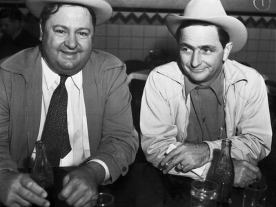 The Texas Sheep and Goat Raisers Association is holding their annual convention in San Angelo, Texas. The 1940 Convention marks the Silver Anniversary of the association. In attendance, left to right, are Tom Richey and Arthur Broome. The men, both residents of San Angelo, Texas, are discussing range and wool conditions over a cold beverage. Mr. Richey is dressed in a hat and suit. Mr. Broome is wearing a cowboy hat, button-up shirt, and a jacket. They are sitting at a counter, with glass soda bottles in front of them.