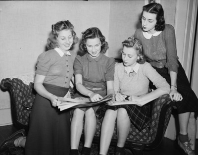 These Arlington Heights High School students have decided that this year they will forgo exchanging $1 Christmas gifts, as has been their custom, and instead will spend those $12 buying clothes for children in need. Left to right, Misses Doris Belle Hill and Doris Rogers scan advertisements in preparation for their shopping spree, while Miss Carol Elmore makes a list and Miss Barbara Bush looks on. Miss Rogers and Miss Elmore are sitting on a couch and Miss Hill is kneeling beside them. Miss Bush is leaning on the armrest of the couch. The girls are dressed in blouses and skirts that vary in length and design.