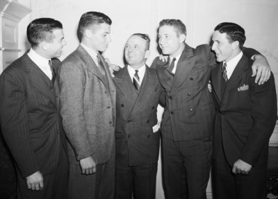 Texas Christian University (TCU) gridders at annual banquet. Left to right, Logan Ware, Bill Crawford, Coach Dutch Meyer, Clarence Alexander, and Phil Roach.