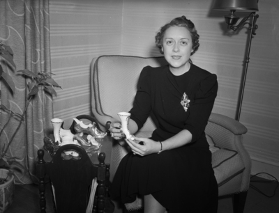 Mrs. H. Malvern Marks Junior, and her collection of little shoes. She has shoes and slippers of soap, brass, wood, china and lacquer. She is sitting down and holding one of her shoes. Next to her is a small table with other tiny shoes on display. Published in the Fort Worth Star-Telegram morning edition, December 3, 1940.