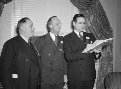 West Central Texas Oil and Gas Association convention met in Abilene. Looking over the program of the association's meeting are (left to right) George Callihan, Abilene, Texas, retiring treasurer of the association; C. W. Hoffmann, Eastland, Texas, former president and re-elected vice president, and Joe A. Clarke, Albany, Texas, retiring president. The men are all wearing suits and ties and are standing in front of a window in a room. Mr. Clarke is making notes on the program while the other two men look on. Published in the Fort Worth Star-Telegram evening edition, December 9, 1940.